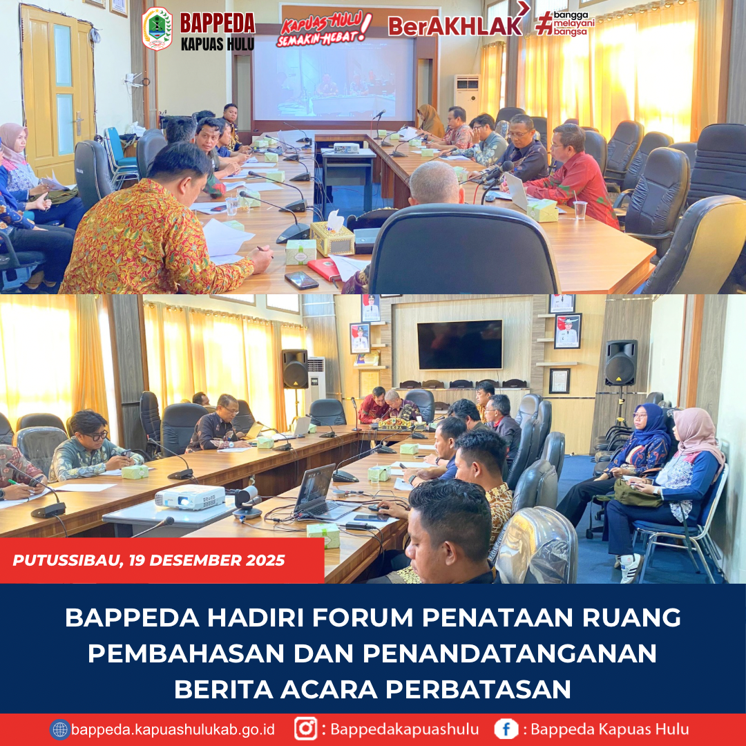 Badan Perencanaan Pembangunan Daerah (Bappeda) Kabupaten Kapuas Hulu yang diwakili oleh Agus Darmanta, S.T., M.T., Kepala Bidang Perencanaan Fisik, Prasarana dan Pengembangan Wilayah, bersama Tim Teknis menghadiri Rapat Forum Penataan Ruang Pembahasan dan Penandatanganan Berita Acara Kesepakatan Perbatasan antara Kabupaten Mahakam Ulu Provinsi Kalimantan Timur dan Kabupaten Kapuas Hulu Provinsi Kalimantan Barat. Kegiatan ini dilaksanakan di Ruang Rapat Bupati Kabupaten Kapuas Hulu, Kamis (18/12/2025), dan dilaksanakan secara daring bersama Pemerintah Kabupaten Mahakam Ulu Provinsi Kalimantan Timur. Rapat dipimpin oleh Plh. Sekretaris Daerah Kabupaten Kapuas Hulu, Iwan Setiawan, M.Si., serta dihadiri oleh perangkat daerah terkait, instansi vertikal, akademisi, perencana profesional, dan tokoh masyarakat. Forum Penataan Ruang ini dilaksanakan sebagai bagian dari proses penegasan dan penyepakatan batas wilayah antar kabupaten, guna memberikan kepastian administrasi dan kesesuaian dengan rencana tata ruang wilayah. Pembahasan difokuskan pada penyelarasan batas daerah agar tidak menimbulkan tumpang tindih pemanfaatan ruang dan menjadi dasar yang kuat dalam perencanaan pembangunan. Plh. Sekretaris Daerah menegaskan pentingnya koordinasi lintas sektor dan lintas daerah dalam penataan ruang, khususnya terkait batas wilayah, agar seluruh kebijakan dan program pembangunan dapat dilaksanakan secara tertib, terarah, dan sesuai ketentuan peraturan perundang-undangan. Melalui forum ini, Pemerintah Kabupaten Kapuas Hulu mendorong terwujudnya kesepakatan batas wilayah yang jelas dan disepakati bersama sebagai landasan perencanaan pembangunan daerah yang berkelanjutan. <p> <span class="fab fa-github">LINK SOSIAL MEDIA BAPPEDA KAPUAS HULU</span></p> <a href="https://bappeda.kapuashulukab.go.id/?fbclid=PAZXh0bgNhZW0CMTEAAabw-Il3uIh5nFu0zbsllA7odTYh3ysl5P4f5L064bf0lS4iWYrlEo5_KAk_aem_lJQj0dZDtdfOn8oq6NDyDA"><img src="http://info.kapuashulukab.go.id/wp-content/uploads/2024/10/Badan-perencanaan-pembangunan-daerah-kabupaten-kapuas-hulu-1080-x-1280-piksel-1080-x-1300-piksel-1-300x113.png" alt="" width="100" height="13" class="elementor-grid-item size-medium wp-image-116618" /></a> <a href="https://www.facebook.com/share/4tqVnS8XkMn7n3ZQ/"><img src="http://info.kapuashulukab.go.id/wp-content/uploads/2024/10/Badan-perencanaan-pembangunan-daerah-kabupaten-kapuas-hulu-1080-x-1280-piksel-1080-x-1300-piksel-300x108.png" alt="" width="100" height="13" class="alignnone size-medium wp-image-116619" /></a> <a href="https://www.instagram.com/bappedakapuashulu/profilecard/?igsh=c3ViOTZ5b3F6Mzls"><img src="http://info.kapuashulukab.go.id/wp-content/uploads/2024/10/Badan-perencanaan-pembangunan-daerah-kabupaten-kapuas-hulu-1080-x-1280-piksel-1080-x-1300-piksel-2-300x80.png" alt="" width="100" height="13" class="alignnone size-medium wp-image-116617" /></a>